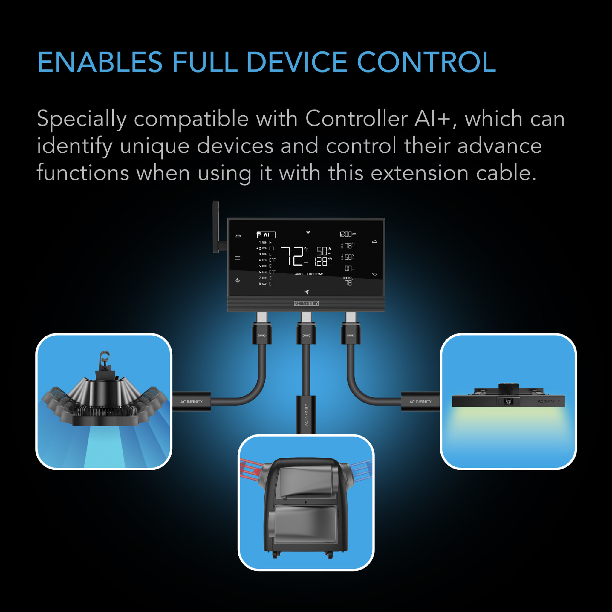 An extension cable designed to connect AC Infinity controllers to smart devices like fans, grow lights, humidifiers, and heaters for use in grow applications. This maximizes the utility of your smart controller by extending its reach to compatible devices while providing intelligent programming like climate triggers, timers, and scheduling. Its compact design is engineered to fit in UIS connectors and ports to ensure a tight, secure connection. Fully compatible with Controller AI+, enabling it to control device-exclusive functions like clip fan oscillation and support unique device identification.